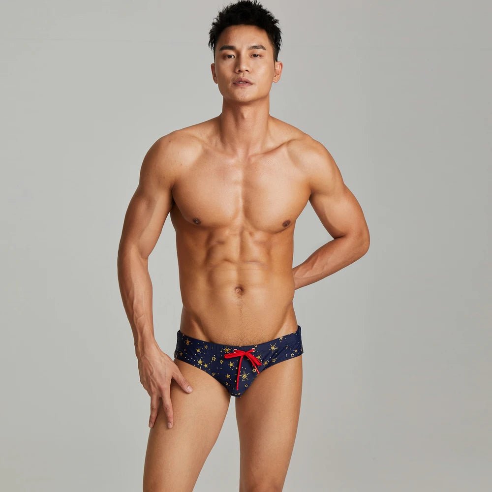 These regal gold star swim briefs are sure to light up anyone's life! The real kicker, though, is the contrasting red drawstring!